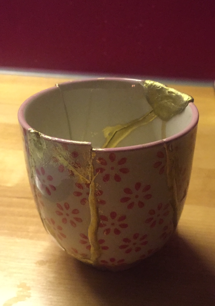 Kintsugi is een oude Japanse techniek, waarbij porselein wordt gerepareerd met goud. Mijn dochter Roos heeft zich gestort op dit bekertje, waar ik aan gehecht bleek toen het viel. Met een prachtig resultaat.